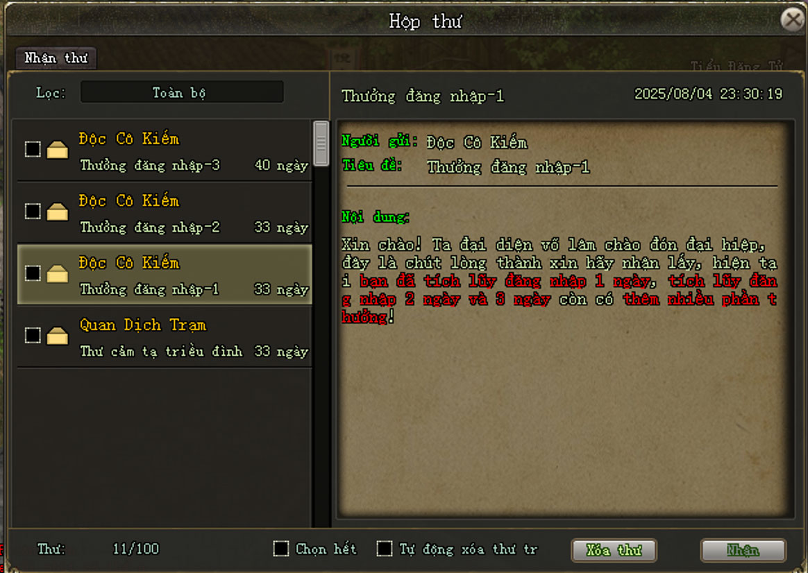 - Thư có hạn trong 30 ngày kể từ ngày hệ thống gửi thư. Quà đăng nhập mỗi ngày có hạn sử dụng 7 ngày kể từ ngày người chơi nhận thư. Người chơi lưu ý kiểm tra hộp thư và nhận thưởng đúng hạn.