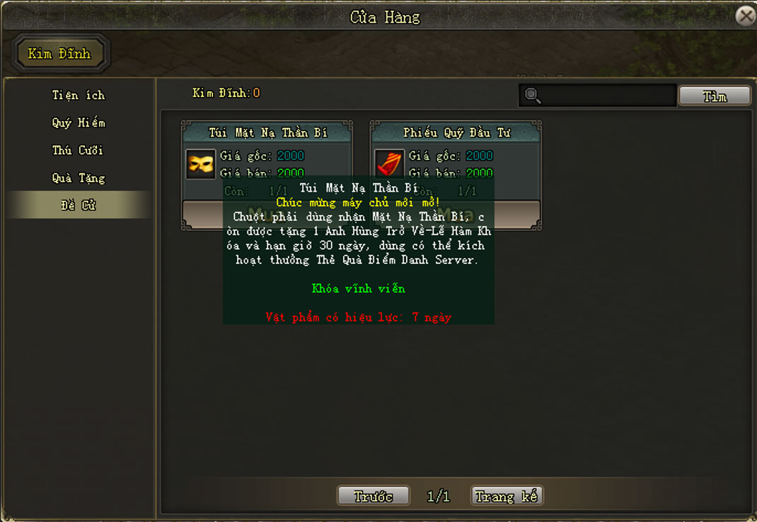 - Túi Mặt Nạ Thần Bí có bán ở tiệm Kim Đĩnh - Đề cử (Giá bán 2000 Kim Đĩnh) và chỉ mở bán trong 30 ngày đầu mở server.