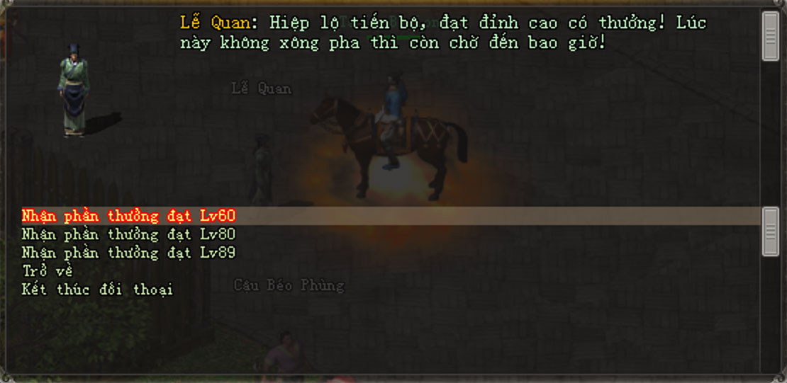 - Khi nhân vật đạt Level60, 80, 89 có thể đối thoại với Lễ Quan nhận thưởng.