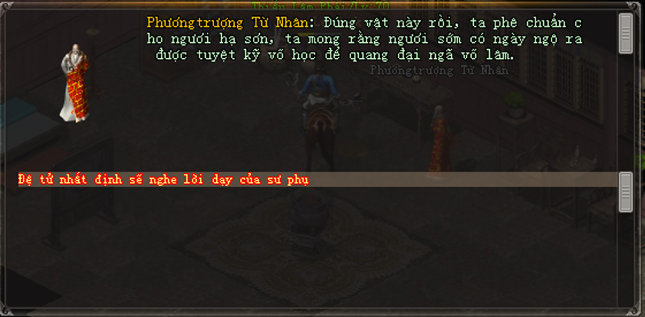 - Đến gặp NPC Chưởng Môn của môn phái hiện tại, chọn lần lượt các dòng chọn: