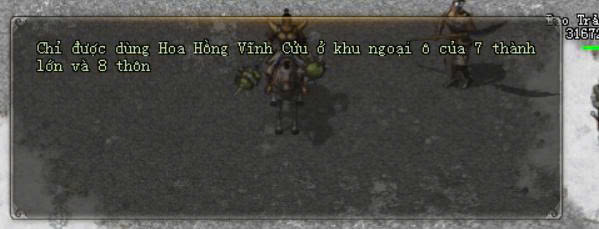 - Hoa Hồng Vĩnh Cửu Chỉ có thể dùng tại khu vực dã ngoại, không thể dùng ở khu vực thành/trấn/bang hội. Khi sử dụng sẽ thông báo tầng số thế giới về tên người sử dụng và địa điểm tọa độ sử dụng:”Nghe nói đại hiệp xxxx đã gieo Hoa Hồng Vĩnh Cửu tại xxx, chờ người hữu duyên”.