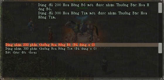 - Sau khi nhân vật sử dụng đến mốc tối đa Hoa Hồng Đỏ và Hoa Hồng Tím có thể đến gặp Long Nhi để nhận vật phẩm đặc biệt. Phần thưởng đạt mốc sẽ khóa vĩnh viễn.