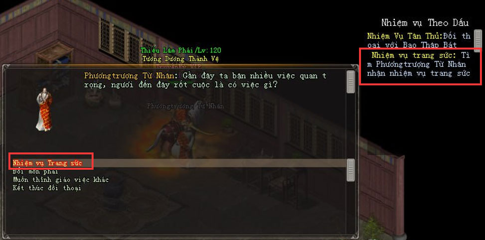 - Bước 1: Đến NPC chưởng môn theo môn phái của nhân vật nhận nhiệm vụ Trang Sức. Đối thoại NPC nhận vật phẩm Hắc Diệu Thạch.