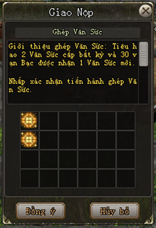 - Chế tạo Văn Sức (theo đặc quyền giao dịch): cần 8 Chú Thiết và 30 Vạn lượng -> 1 Văn Sức.